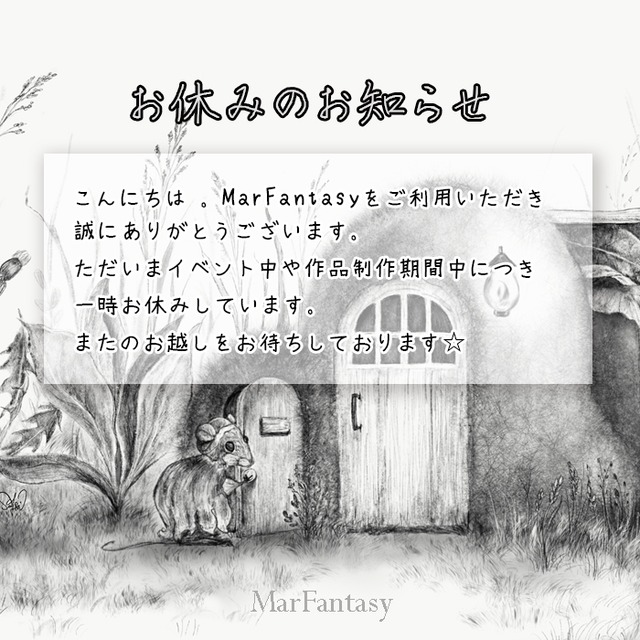 只今【お休み中】 いつもMarFantasyをご利用いただきまして誠にありがとうございます。 展示会などのイベント時や、作品制作期間中は、対応が遅くなるため一時closeさせていただきます。 期間限定でオープンする際に、インスタグラムやFacebook でお知らせいたしますので、ぜひご利用くださいませ。 お問い合わせはインスタDMで、気軽にご連絡ください。 Instagram@marfantasy